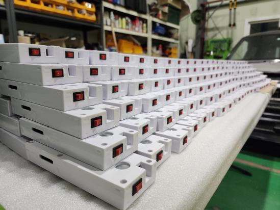 S사 주문 개발·생산품. 봉제 라인의 생산 수량과 시간을 실시간으로 모니터링하는 IOT 기반 스마트 카운터 시스템입니다. 시스템 설계, 프로그램 제작, 회로 제작, 금형 설계까지 전 과정을 자체 수행했습니다.